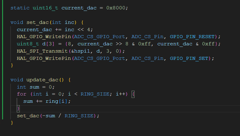 The algorithm uses a ring buffer to average phase measurements, implementing a form of PI control with adjustable gain.