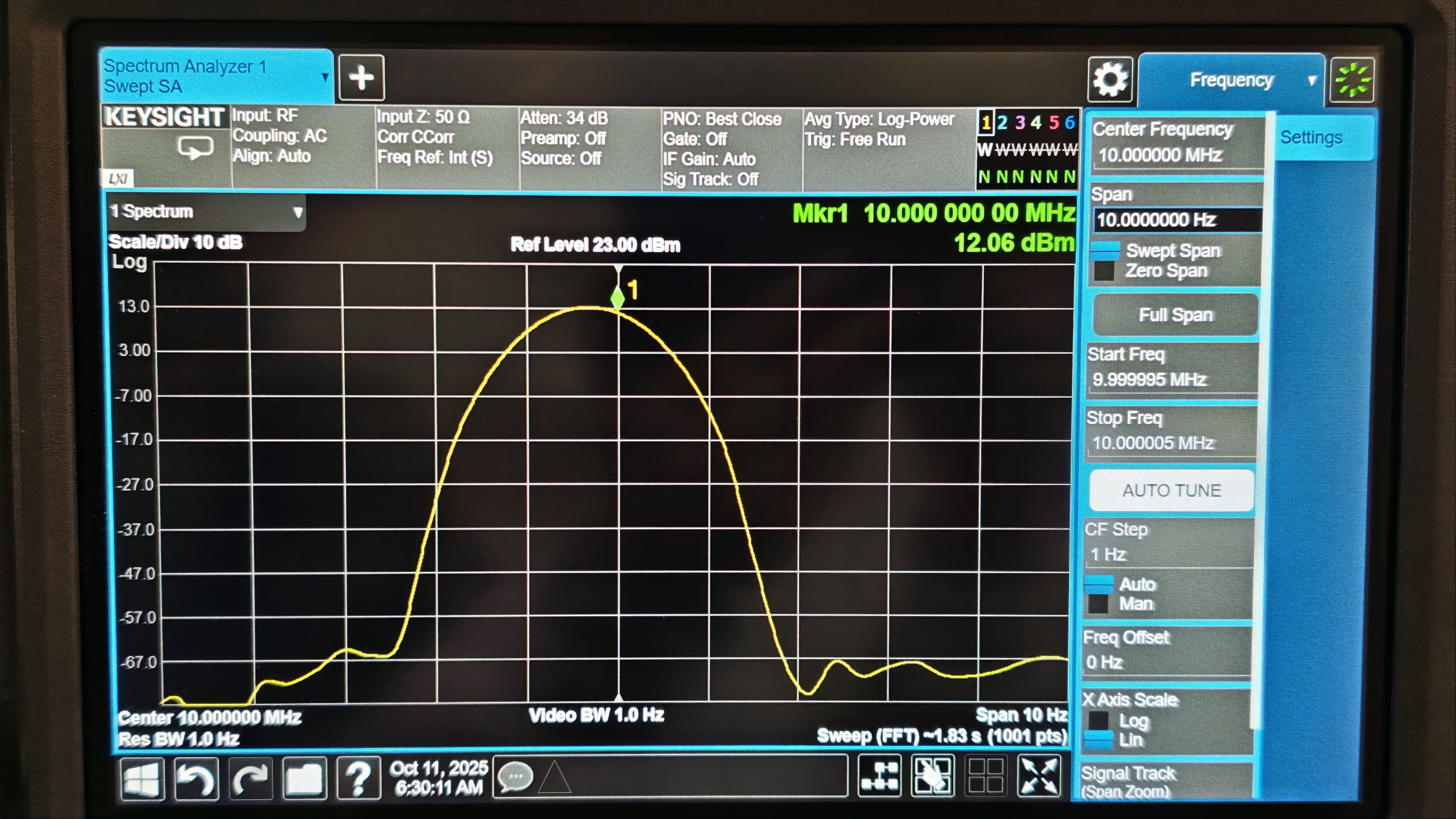 - Phase Noise: Better than -70 dBc/Hz at 1Hz offset (limited by testing equipment)