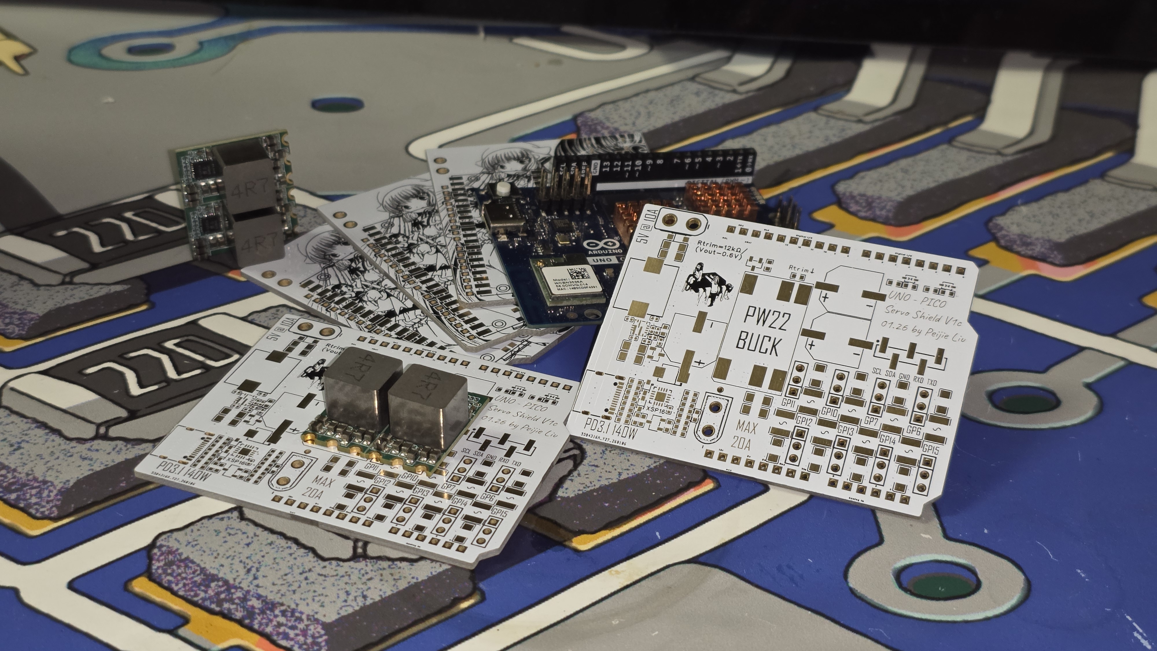 The SIC431 is officially rated for 24V max input, but I’ve tested it up to 28V and it runs stable. I had already designed a 24A buck module with this chip previously, so I could mount it directly on the shield - perfect reuse.