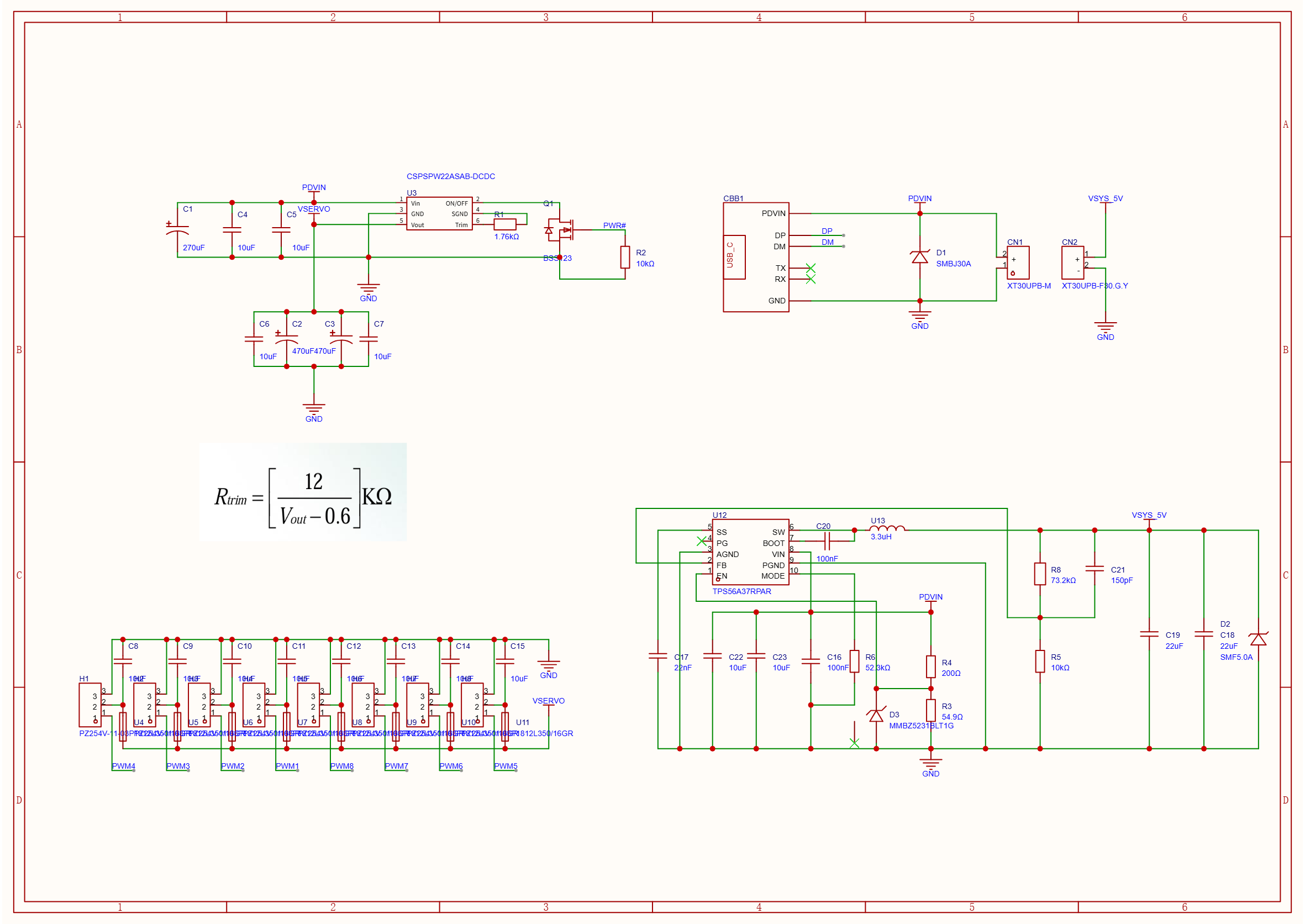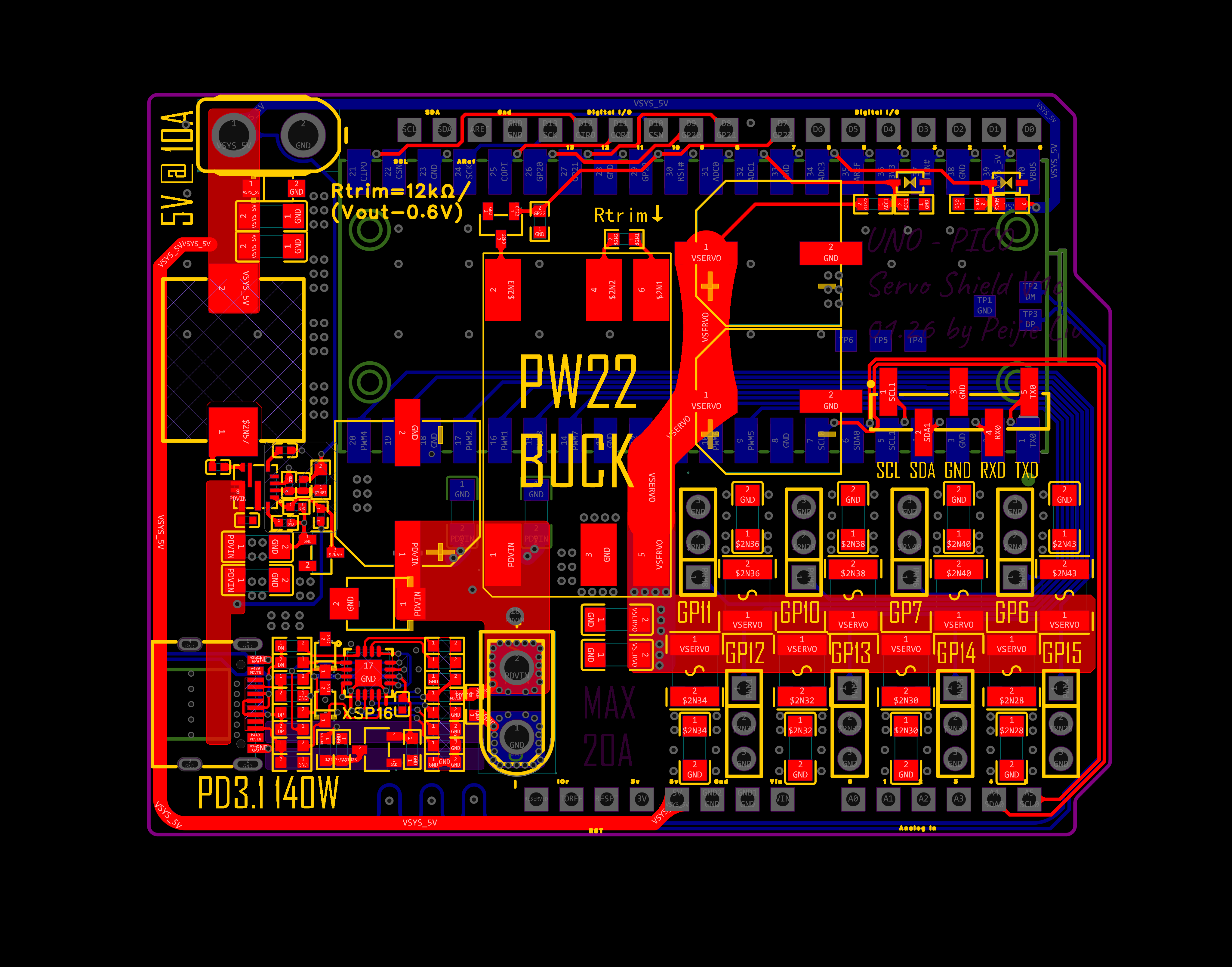 - Servo power traces: Copper pour equivalent width >250 mil (6.35mm) to handle peak current draws